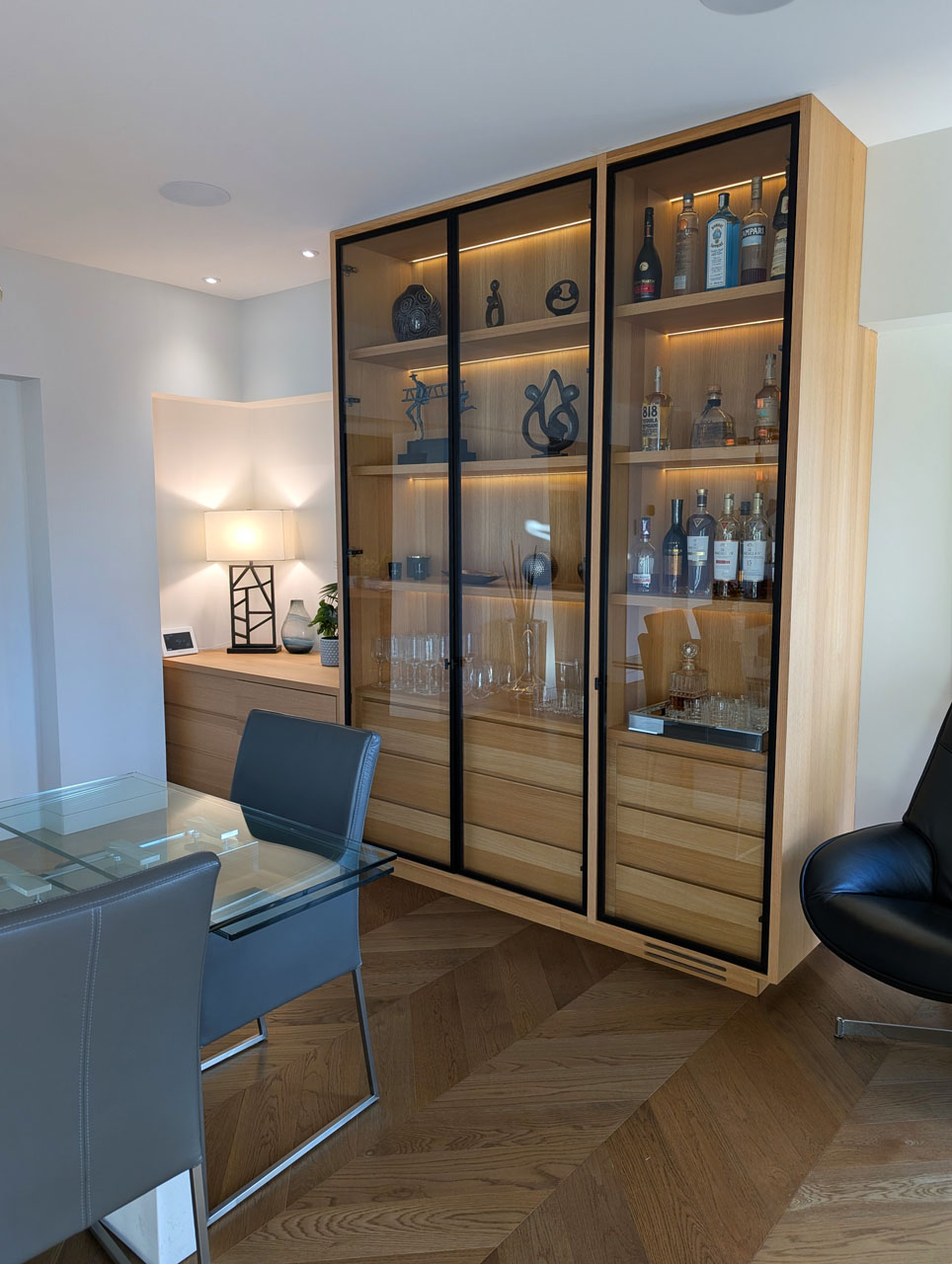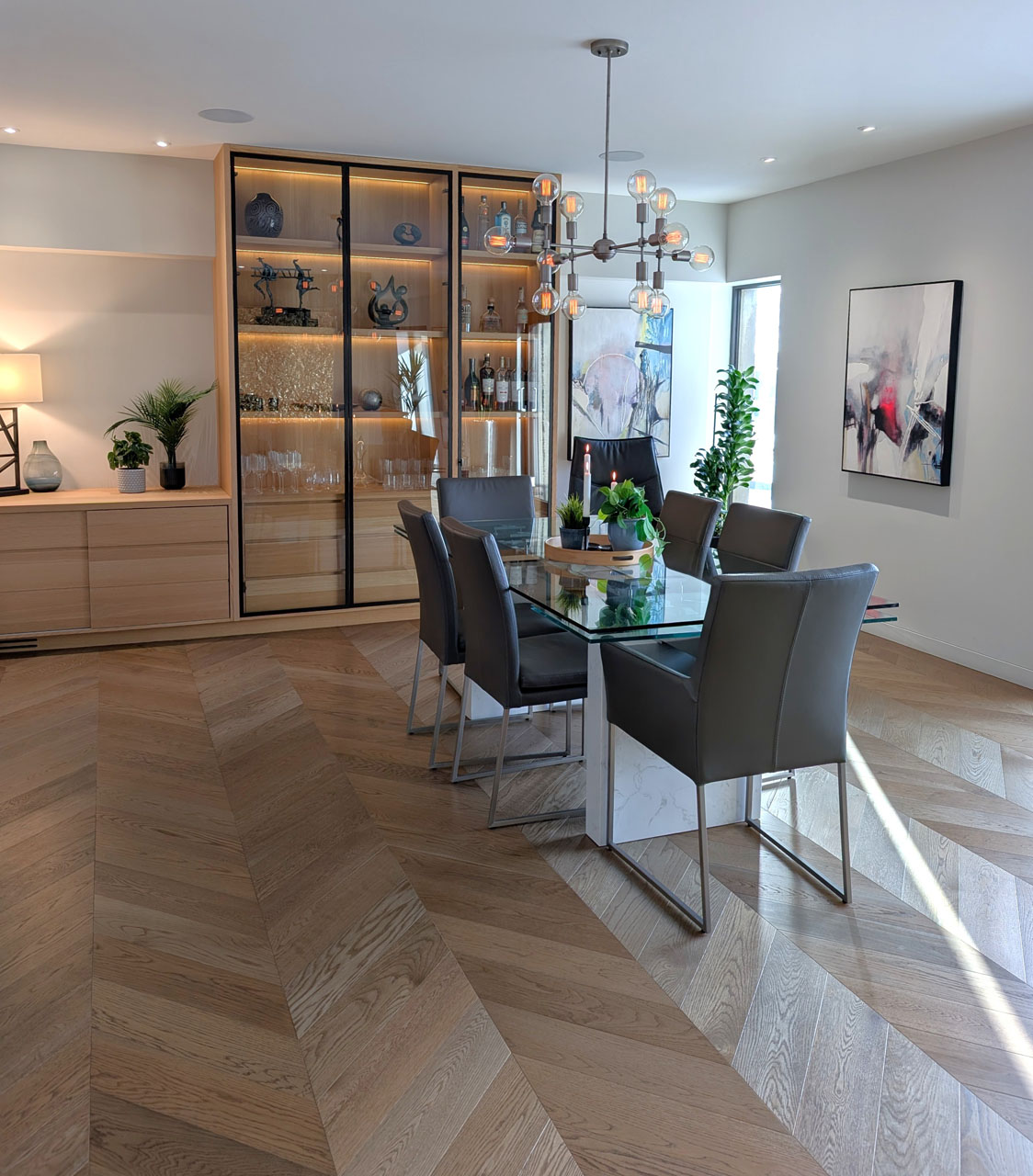Our mandate: The client wanted a sleek and modern open space that worked with the existing footprint. The glass-enclosed wall storage is stunning, especially with the accent lighting that was built into the unit. The central focal point separating the living and dining areas is a dramatic supporting wall with its built-in functional storage and large screen tv. This type of setup is uncommon, so he was having a challenge with the layout. We assisted the client in all material selections, finishes, lighting, furniture, cushions, colours in the open plan floor plan and design. The entire living space is uncluttered, cohesive, and provides a great space for entertaining.