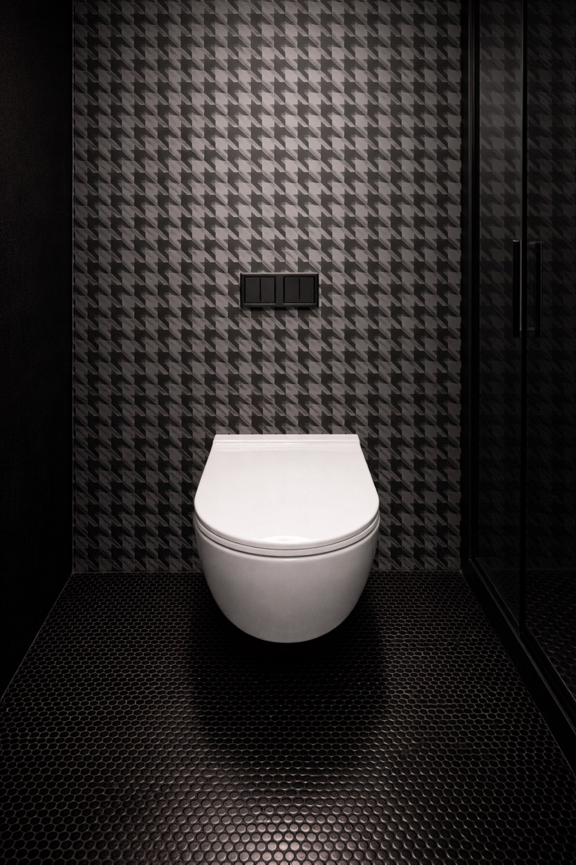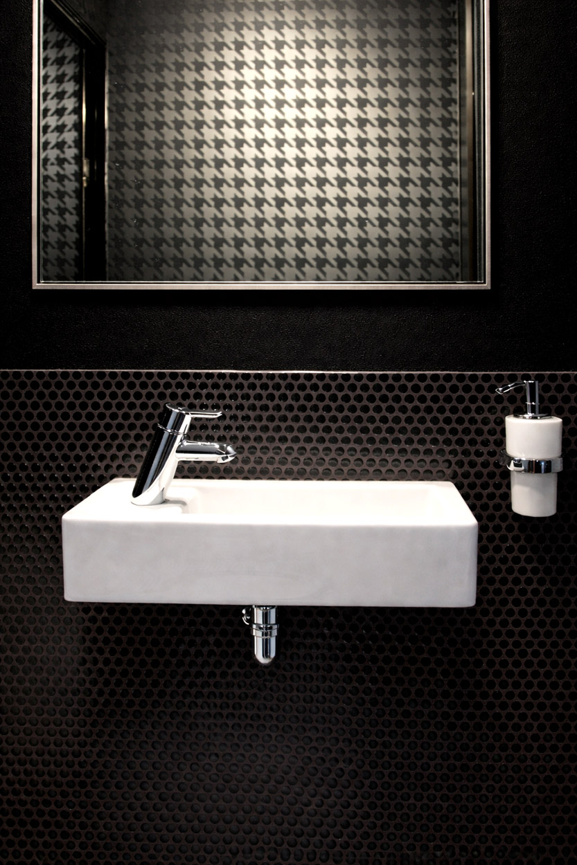 Our mandate: The clients wanted a unique and eclectic style powder room. We sourced out the gorgeous high-gloss black penny tile as well as the large-scale hound’s tooth wallpaper. A dramatic colour palette of silver and black create a personalised space that makes a great style statement.