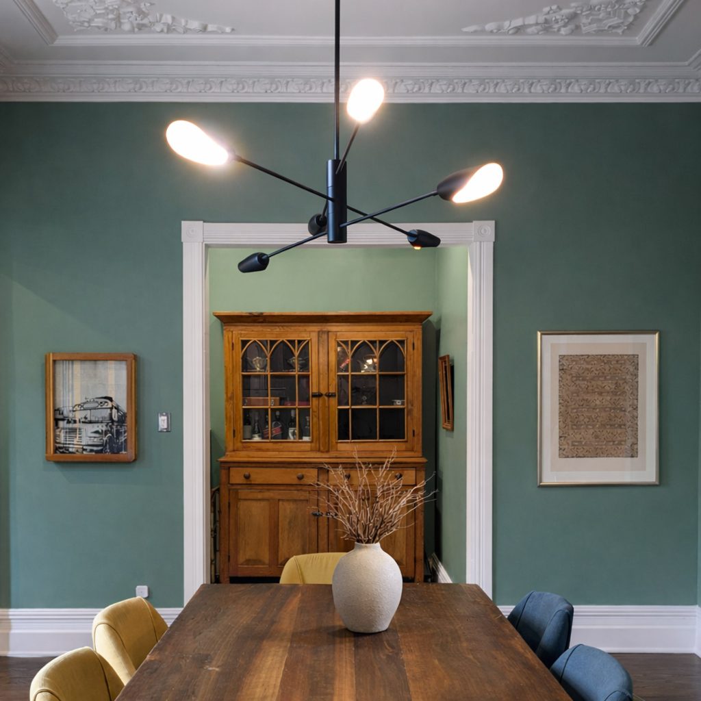 Matériaux utilisés : peinture Sherwin Williams, parquet en chêne teinté foncé, œuvre d’art originale, table à manger en bois de noyer, chaises de salle à manger en tissu bleu et jaune, suspension de table à manger contemporaine en fer noir.
